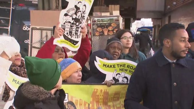 Нью-Йорк- Демонстранты собрались на станции метро Myrtle-Wyckoff, в поддержку двух женщин, которые были обвинены полицией Нью-Йорка за продажу продуктов питания без разрешения на торговлю в метрополитене.