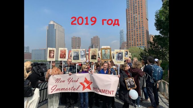 Видео записанное на марше — параде Бессмертный Полк в Манхеттене, который собрал сотни «соотвечественников». Множество людей собрались на марш в центое Нью-Йорка, большинство с портретами погибших на шестах , красными звездами, некоторые в советских военных пилотках и даже в советской военной форме, на видео видно представителей Севастополя с плакатом «Город — герой Севастополь» , «Бессмертный полк панфиловцы»,