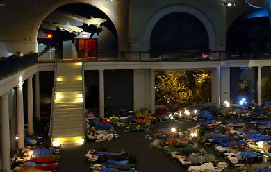 После ночи, проведенной в почти пустых залах музея (но будет выставка с мумиями Mummies ) , посетители могут остаться с ночевкой в музее в спальном мешке на раскладушке под голубым китом длиной 94 фута в Milstein Hall of Ocean Life.