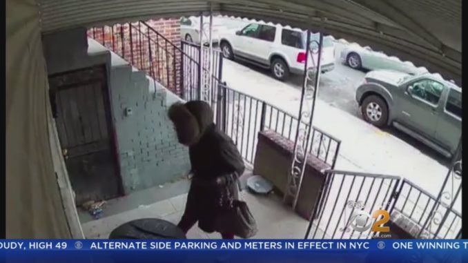 Камера наблюдения запечатлела женщину, которая крадет пакет с парой ботинок с крыльца дома в Бруклине.