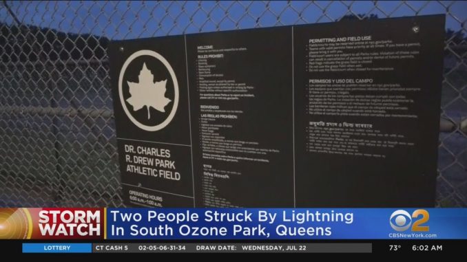 НЬЮ-ЙОРК  Удары молнии во время штормов в среду вечером в Нью-Йорке были крайне  опасны. Два человека были поражены молнией в Южном Озоновом Парке, Квинс. Оба находятся в больнице. Их состояние пока неясно. В том же районе молния  ударила в  шпиль церкви где вспыхнул огонь. Там никто не пострадал.