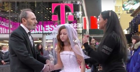 В Нью-Йорке провели социальный эксперимент, подчёркивающий проблему детских браков. На прошлой неделе в Нью-Йорке прошёл социальный эксперимент: на Таймс-сквер вышла фотографироваться свадебная пара — 65-летний мужчина и его 12-летняя невеста. Вскоре после того, как они начали фотографироваться, держась за руки, от толпы последовала реакция. К девочке, которая всё это время растерянно смотрела в пол, начали подходить люди и интересоваться, сколько ей лет, на что жених отвечал, что у него есть разрешение их родителей. Со временем толпа становилась всё более агрессивна, и несколько человек начали открыто угрожать 65-летнему мужчине, требуя отпустить невесту.