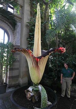 Печально известный Труп Цветок или Аморфофаллус титанический (Amorphophallus titanum) — крупное тропическое растение; Один из самых известных видов рода, имеет одно из крупнейших соцветий в мире, испускает запах гниющего мяса, когда она расцветает. Аромат цветка напоминает смесь запахов тухлых яиц и тухлой рыбы, а по внешнему виду цветок напоминает разлагающийся кусок мяса