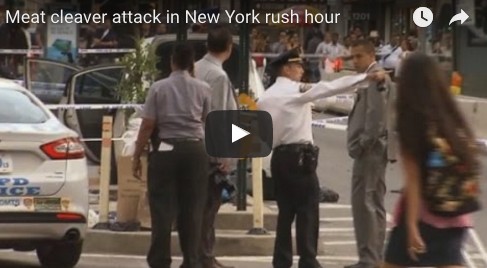 Полиция Нью-Йорка говорит, что человек, владеющий мясным тесаком полоснул дежурного офицера в центре Манхэттена в час пик.