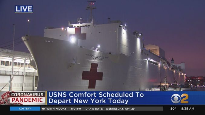 НЬЮ-ЙОРК — USNS Comfort отправляется из Нью-Йорка сегодня в полдень, ровно через месяц после его прибытия. С 30 марта судно военно-морского госпиталя пришвартовалось к причалу на западной стороне Манхэттена. Оно начало принимать пациентов с коронавирусом через неделю. Планируется, что Comfort вернется в Норфолк, штат Вирджиния, где он будет готов к любым будущим развертываниям, необходимым во время пандемии.