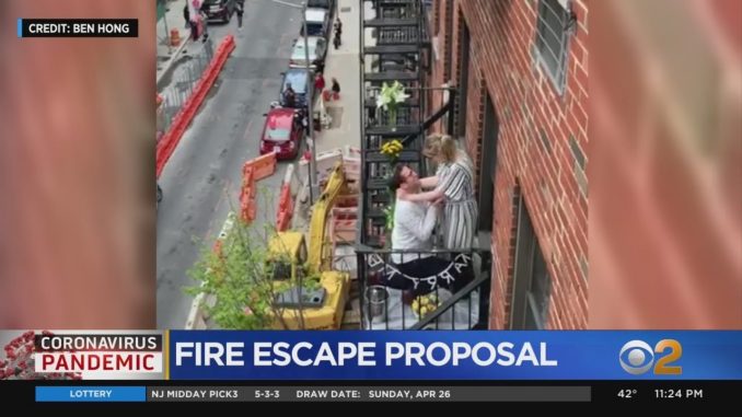 НЬЮ — ЙОРК — Приветствия для медицинских работников может звучать немного громче в один прекрасный вечер на Верхнем Ист — Сайде. Это потому, что одна врач получила сюрприз на всю жизнь — предложение руки и сердца на пожарной лестнице, и ее соседи были там, чтобы засвидетельствовать все. Аарон Лессер рассчитал свое предложение именно в этот момент, чтобы показать Талии Старк, его девушке, что она значила для него и для всего мира. Он упал на одно колено в прошлый четверг, когда в городе начался священный ритуал аплодисментов для работников здравоохранения.