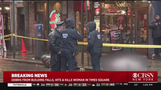 НЬЮ-ЙОРК — Женщина была убита, когда во вторник утром на Таймс-сквер ее поразил обломок декоративного фасада дома, об аварийном состоянии которого предупреждали городские инспекторы Департамента зданий еще в апреле прошлого года. Полиция сообщила, что кусок упал около 10:45 утра на 152 вест 49- й улице между Шестой и Седьмой авеню. 60-летняя жертва была найдена лежащей на тротуаре с травмой головы. Она была объявлена мертвой на месте происшествия. По сообщению городского департамента зданий, уведомление о нарушении было выпущено 29 апреля и свидетельствует о том, что внешний терракотовый фасад над 15-м этажом здания не был в надлежащем состоянии и представлял опасность для пешеходов.