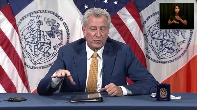 Билл де Блазио, мэр Нью-Йорка на встрече с медиа о вакцинации и безопасности от вируса КОВИД 19 школ в городе.
