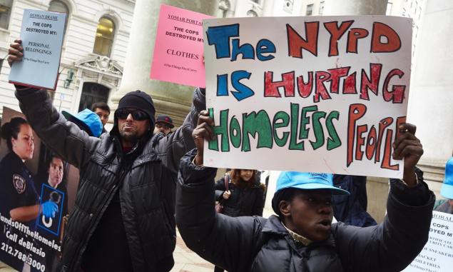 Бездомные ньюйоркцы подали иск против полиции и власти Нью-Йорка. Их пресс-конференция прошла в Фоли-сквер. Они заявили, что их вещи были уничтожены NYPD в октябре, их просто выбросили в мусорные баки.