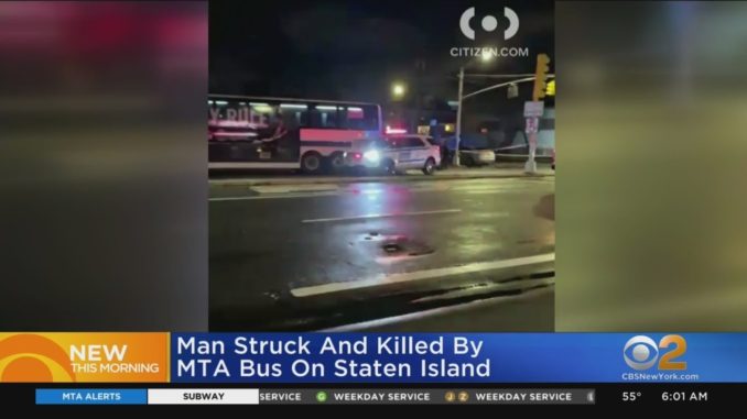 НЬЮ-ЙОРК — 63-летний мужчина был сбит насмерть автобусом MTA на Статен-Айленде. Это произошло вскоре после 22:00, в понедельник на бульваре Хилан и авеню Эббитс. Полиция заявила, что мужчина шел по пешеходному переходу, но вопреки сигналу светофора. Его опознали как Патрика Михана из Статен-Айленда. Водитель автобуса остался на месте, и ему не было предъявлено обвинение.