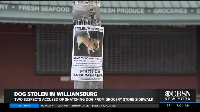НЬЮ-ЙОРК — Полиция разыскивает пару воров, которых запечатлела камера наблюдения в Бруклине. Мужчины якобы украли 10-летнюю смесь бордер-терьера по имени Тео из продуктового магазина в понедельник в Вильямсбурге. Полиция сообщила, что его 21-летняя владелица оставила собаку на поводке возле рынка на углу улицы Гумбольта и Флашинг-авеню. Когда она вышла из магазина около 9 вечера, от собаки остался только поводок. Согласно описанию, у собаки есть прикус, мутные глаза и шишка на бедре. Любой, у кого есть информация, должен позвонить по горячей линии NYPD Crime Stoppers по телефону 1-800-577-TIPS (8477) или 1-888-57-PISTA (74782) для испанского. Вы также можете отправить подсказку через веб-сайт Crime Stoppers, написав в Твиттере @NYPDTips или отправив сообщение на номер 274637 (ПРЕСТУПЛЕНИЯ), а затем введя TIP577.