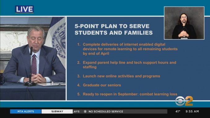 НЬЮ-ЙОРК . В настоящее время государственные школы Нью-Йорка закрыты до 20 апреля, но не будут закрыты до конца 2019-2020 учебного года из-за вспышки коронавируса. Сказав, что «риски не перевешивают вознаграждение», мэр Билл де Блазио объявил в субботу об изменении политики в отношении 1,1 миллиона студентов, поскольку вспышка COVID-19 продолжается в области Tri-State.