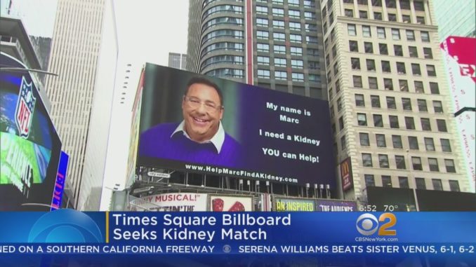 Марк Кидней , выживший после рака, теперь пытается найти подходящую пару от донора на пересадку почки, и передает свое послание на перекрестке Мира на Times Square.
