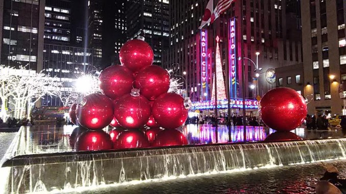 Гигантские елочные новогодние — рождественнские игрушки — елочные шары, гирлянды, олени — традиционно к Рождественским праздникас размещают в Манхеттене на Щестой Авеню в районе 45 — 48 стрит. Фотографии ночного Нью-Йорка сделаны смартфоном.
