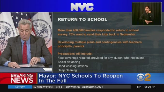 НЬЮ-ЙОРК — Нью-йоркские школы готовятся к тому, чтобы «максимальное количество» учеников вернулось в сентябре, заявил в четверг мэр Билл де Блазио. Мэр процитировал опрос Министерства образования, который собрал ответы более чем 450 000 семей . Он сказал, что 75% поддержали возвращение в школу осенью.