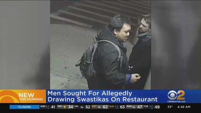 Рабочая группа полиции Нью-Йорка по борьбе с преступлениями на почве ненависти разыскивает мужчин, показанных в этом видео. Их обвиняют в том, что они рисовали свастики на стене ресторана в Гринпойнте, Бруклин. Подозреваемые нарисовали символы ненависти и написали ненормативную лексику в мексиканском ресторане на Манхэттен-авеню
