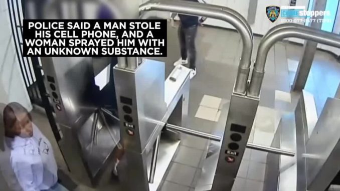 НЬЮ-ЙОРК — Полиция Нью-Йорка продолжает искать мужчину и женщину, которые, по их словам, напали на мужчину после того, как он попросил одного из них надеть маску на станции метро в Бруклине. Это произошло около 19:30 во вторник на станции Юнион-стрит линии М. По данным полиции, подозреваемый отобрал мобильный телефон жертвы и швырнул его на землю. На видеозаписи можно увидеть, как подозреваемая распыляет в лицо жертве неизвестное вещество. Пострадавший госпитализирован в стабильном состоянии. В понедельник MTA начало взымать штрафы в размере 50 долларов для пассажиров, которые не носят защитные маски в транспортной системе.Любого, у кого есть какая-либо информация, просят позвонить на горячую линию NYPD Crime Stoppers по телефону 1-800-577-TIPS (8477) или для испанского языка 1-888-57-PISTA (74782). Вы также можете отправить совет в Twitter, @NYPDTips . Все звонки конфиденциальны.