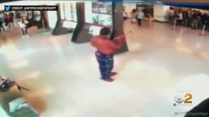 Чиновники полиции Нью-Йорка позже выпустили видео наблюдения об инциденте. Камеры запечатлели мужчину, который, похоже, направил клинок на свою грудь, прежде чем его окружил рой офицеров.