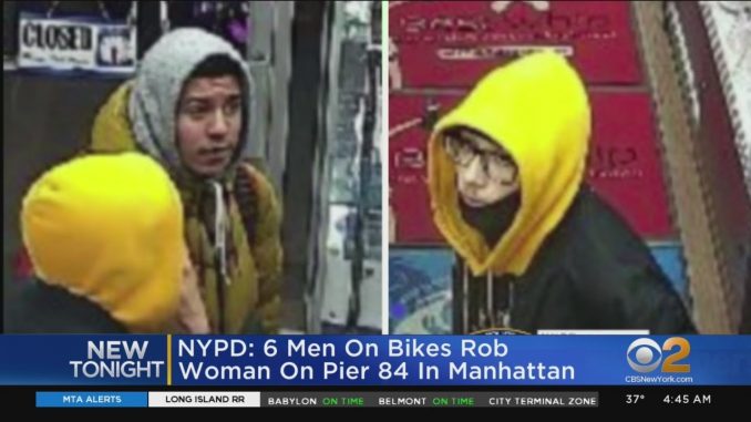 НЬЮ-ЙОРК — Группа мужчин на велосипедах окружила женщину и украла ее сумочку в пятницу на Манхэттене. Ограбление произошло около 6 часов вечера на Pier 84 около 12- й авеню. Полиция сообщила, что подозреваемые приблизились к 41-летней жертве, и один мужчина показал оружие и потребовал ее деньги. Женщина передала сумочку, в которой находились 60 долларов, кредитные карты и мобильный телефон. Полиция сообщила, что ее кредитные карты позже использовались для покупки товаров на сумму более 640 долларов в трех аптеках CVS и в табачных магазинах. Любого, у кого есть информация об ограблении, просят позвонить на горячую линию NYPD Crime Stoppers.