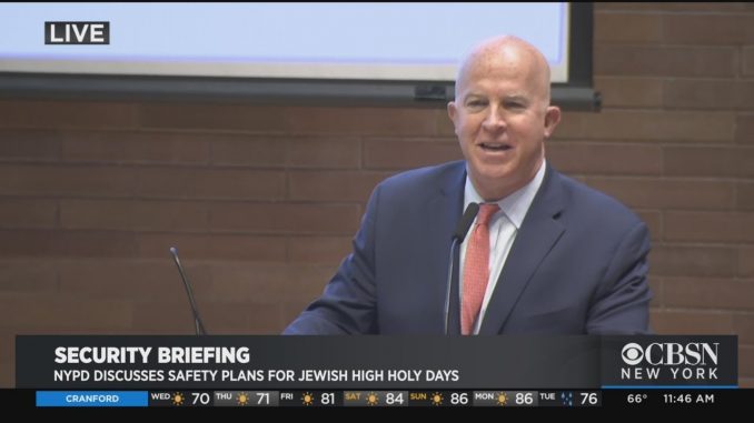 Мэр Билл де Блазио, комиссар полиции Джеймс О’Нил и другие лидеры рассказывают о мерах безопасности на вренмя проведения еврейских праздников в этом году.
