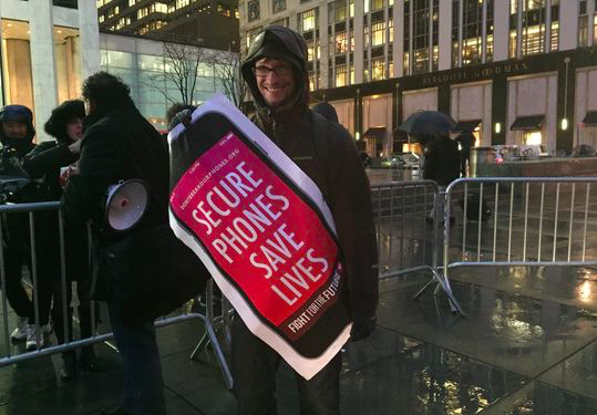 Несмотря на ветер и дождь, около 8 протестующих стояли перед главным входом магазина компании Apple в Нью-Йорке на Манхэттене во вторник вечером. Был организован протест, чтобы защитить компанию Apple, и собравшиеся люди были разочарованы количеству людей которые пришли. На протяжении вечера подходили люди с плакатами и присоединялась к акции. В основном это молодые люди 20-30 лет, которые считают продукцию Apple самой удобной для работы.