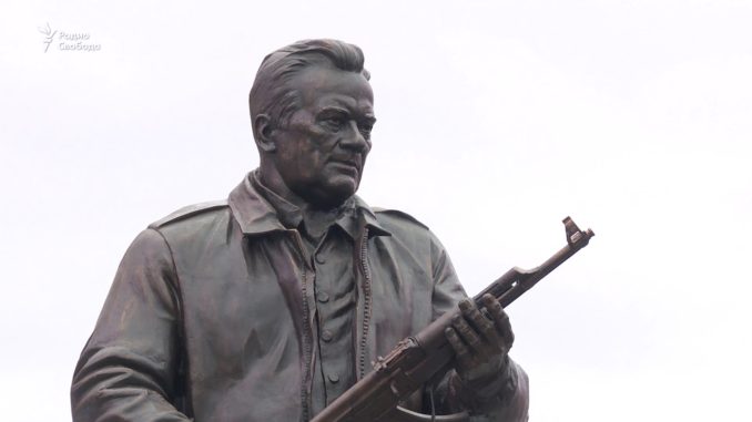 Современная Россия —  памятник якобы плагиатору немецкого оружия быо установлен в Москве с  участием попа и протестующего…        «Конструктор оружия = смерти конструктор». — вышедший с таким плакатом мужчинв был задержан правоохранительными органвми российской федерации …  Сам памятник человеку с автоматом  — Михаилу Калашникову, официально в России почитающемуся «изобретателем» автомата АКМ   —  оружия,  от которого в «послевоенное мирное» время различными неленальными , террористическими и антикапиталистическими режимами и групами  было убито в мире намного больше мирных людей, чем погибло  от атомных взрывах во время Второй Мировой войеы.  Печальное зрелише прославления автомата — любимого оружия террористов  в сердце России  впечатляет .