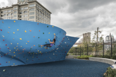 В прошлом году местная скалолазная компания The Cliffs открылась в открытом тренажерном зале на 7800 квадратных футов в парке Бруклин-Бридж. Теперь The Cliffs официально откроется в этом сезоне в субботу, 15 апреля.