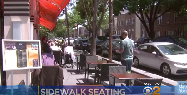 В Нью-Йорке, районе Квинс все больше и больше появляются уличных кафе, которые занимают своими столиками большую часть тротуаров. С потеплением владельцы кафе выставляют на улице столы и стулья и не всегда это нравится людям которые гуляют по этим улицам.