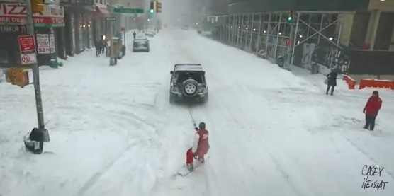 Видимо некоторые жители Нью-Йорка ждали снегопада, чтоб покататься на сноуборде и на лыжах прям в городе. Парни сняли видео, как они катаются на бордах держась за веревку, которая прицеплена к машине.