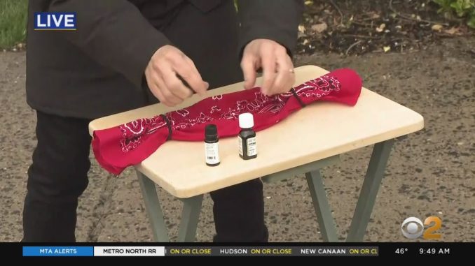 Нью-Йорк Быстрый способ сделать маску это сложить бандану или большой носовой платок вокруг двух резинок для волос с каплей эфирного масла, чтобы образовать границу из ткани через рот, которая будет работать как временная маска.
