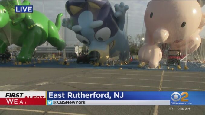 Ежегодный праздник на стадионе в Нью-Джерси служит еще тренировкой для пробного запуска наполненных воздухом громадных надувных персонажей перед парадом Мэйси в День благодарения в Манхеттене.