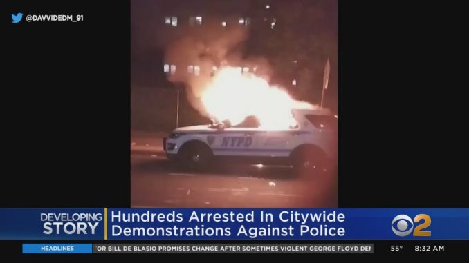 НЬЮ-ЙОРК — Сотни людей были арестованы в Нью-Йорке после того, как мирные протесты превратились в хаос. Демонстранты столкнулись с офицерами и подожгли автомашины полиции Нью-Йорка, призывая положить конец жестокости полиции после смерти Джорджа Флойда . NYPD сообщает, что по меньшей мере 345 человек были арестованы в ходе субботних ночных акций протеста, 47 автомобилей NYPD были повреждены и 33 офицера получили ранения. Ни одна из травм не угрожает жизни. Протесты идут по всему городу, в том числе в Центре Barclays третий день подряд.