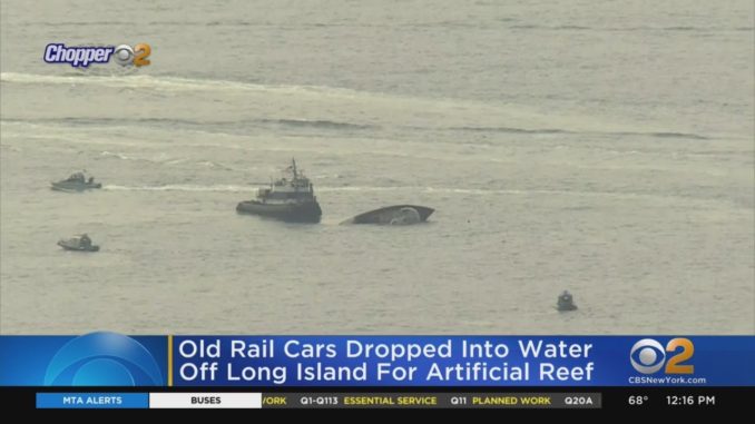 Нью-Йорк — Старые железнодорожные вагоны и другое крупное оборудование получают новую жизнь став частью искусственного рифа. Во вторник утром, небольшая лодка и железнодорожный вагон были сброшены в воду у побережья Лонг-Айленда. Риф, называемый Hempstead Reef, находится недалеко от Point Lookout.