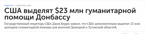 Государственный секретарь США Джон Керри заявил, что США дополнительно выделит 23 млн долларов гуманитарной помощи для жителей Донецкой и Луганской областей. «Я сегодня сказал президенту Порошенко, что Соединенные Штаты предоставят дополнительно 23 млн долларов гуманитарной помощи, чтобы помочь тысячам людей, которые пострадали от конфликта в Восточной Украине», – сказал он на совместном с президентом Украины Петром Порошенко брифинге в четверг в Киеве.