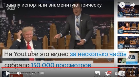 На популярном в США ток-шоу Дональд Трамп позволил испортить свою знаменитую прическу. После шоу фотографам запретили снимать испорченную прическу Трампа. На Youtube это видео за несколько часов собрало 150 000 просмотров.