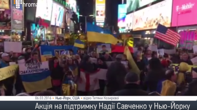 50 украинцев вышли на Таймс Сквер с требованиями освободить украинку Надежду Савченко. «Путин — убери руки от Украины» — скандировали они.