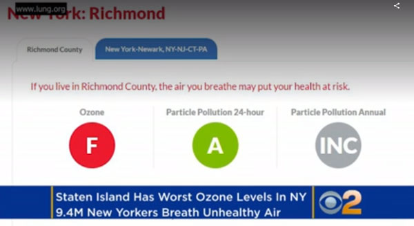 Стейтен-Айленд имеет худшие уровни озона в Нью-Йорке в соответствии с докладом «Состояние воздуха» Американских ассоциаций легких (American Lung Associations) 2018 года.
