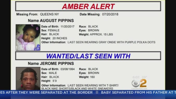 AMBER Alert (система оповещения о похищении детей) была применена для 8-месячной девочки. В полиции говорят, что ее забрали у матери в Квинсе в конце пятницы. Полиция утверждает, что 8-месячная Август Пиппинс (August Pippins) была похищена ее 24-летним отцом Джером Пиппинсом около 10 вечера в мотеле недалеко от скоростной автомагистрали Ван-Вайк напротив Медицинского центра Jamaica Hospital.