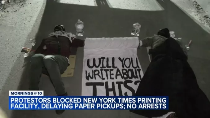 Рой антиизраильских протестующих рано утром в четверг атаковал типографию New York Times в Квинсе и обвинил центр в изготовлении «согласия на геноцид».