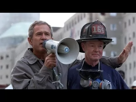 «Я чувствовал, что мне нужно что-то сказать. И я встал на кучу обломков и хотел, чтобы со мной был пожарный», — сказал Буш. «Это было заявление солидарности, и я встаю на этот огонь — оказывается, это уничтоженная пожарная машина».