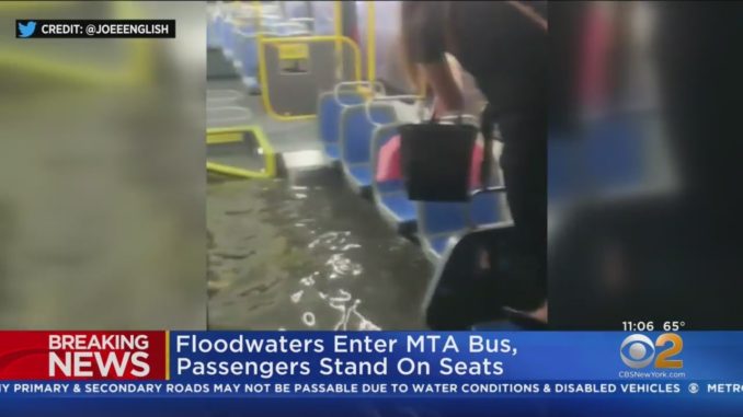 Как видно на видео вода затопила городской автобус MTA — так что пасcажиры были вынуждены стать на кресла. Кто из городских властей мэра «социалиста Де Блазио» ответит за состояние ливневой канализации в Нью-Йорке ? Ответи известен — никто , «виновато глобальное потепление» и «недостаточная инклюзивность и белый суперматизм» — а не безрукость «прогрессивных демократов»