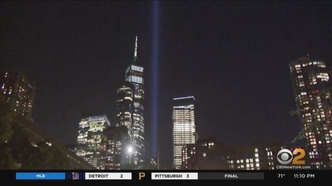 НЬЮ-ЙОРК. ПО ТРАДИЦИИ В ПАМЯТЬ О ЛЮДЯХ, ПОГИБШИХ В ТЕРРОРИСТИЧЕСКОЙ АТАКЕ НА АМЕРИКУ 11 СЕНТЯБРЯ 2001 года — В ДАУНТАУНЕ МАНХЕТТЕНА БУДУТ ЗАЖЖЕНЫ ПРОЖЕКТОРЫ, ИМИТИРУЮ ДВА УНИЧТОЖЕННЫХ ТЕРРОРИСТАМИ НЕБОСКРЕБА — БЛИЗНЕЦА .