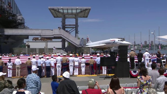 Губернатор штата Нью-Йорк Кэти Хокул и мэр Нью-Йорка Эрик Адамс выступили с речью на церемонии, посвященной Дню памяти, в музее Intrepid Sea, Air and Space Museum находящемся на территории авианосца времен Второй Мировой войны Интерпид.