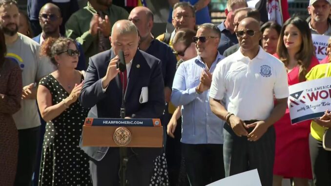 Мэр Эрик Адамс: Большое вам спасибо. Спасибо, комиссар. И действительно хочу поблагодарить наших коллег, которые здесь, объединившись, разные взгляды, взгляды политического спектра, разные подходы к вещам, но мы объединены одной и той же концепцией и верой, которая является предшественником сна, который позволяет нам испытать американскую мечту. это право на труд, право на победу, право обеспечивать свою семью.