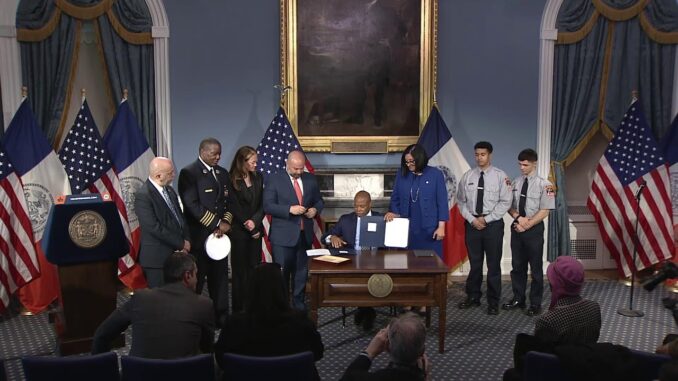 – Мэр Нью-Йорка Эрик Адамс сегодня подписал два закона: один требует от города предоставления бронежилетов, а второй предусматривает обучение по деэскалации и самообороне для всех пожарных служб города Нью-Йорка (FDNY). Техники скорой медицинской помощи (ЕМТ) и парамедики. Хотя администрация Адамса уже предоставляет бронежилеты всем членам Службы неотложной медицинской помощи (EMS) FDNY, этот закон закрепляет, что все члены FDNY EMS будут иметь доступ к этой защите на постоянной основе.