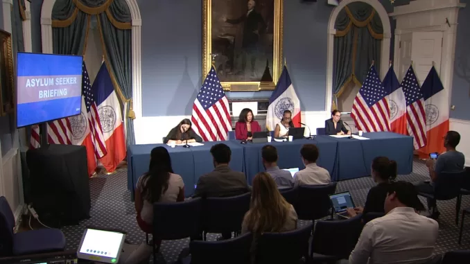 Видео в начале этой страницы: Заместитель мэра по вопросам здравоохранения и социальных служб Энн Уильямс-Исом проводит брифинг по вопросам реагирования лиц, ищущих убежища, в синей комнате мэрии Нижнего Манхэттена, 4 октября 2023 года.