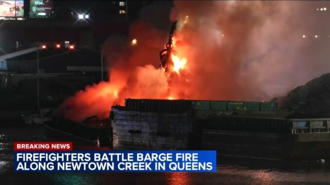 ЛОНГ-АЙЛЕНД-СИТИ, Квинс — клубы дыма заполнили ночное небо после того, как ночью во вторник загорелась огромная баржа.