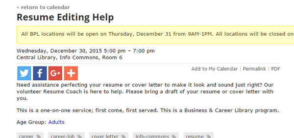 У Вас достаточный английский для поиска работы в Нью-Йорке — но ваше резюме не выглядит профессионально ? В 5 часов вечера 30 декабря 2015 года индивидуальную помощь в подготовке и редактированию резюме на английском языке предлогает Центральная Библиотека на Гранд Арми Плаза.