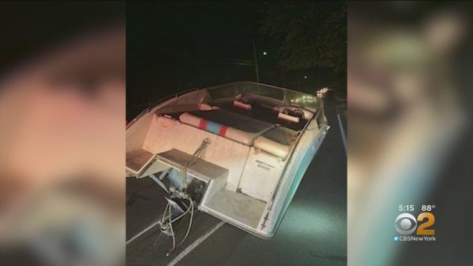 Полиция рвзыскивает владельцев катера, оставленного на платформе посередине Rockland County road дороги.