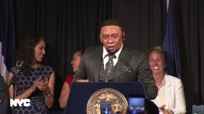 Приветствие «прогрессивного» мэра Нью-Йорка началось с перечислением счастливым голосом — «прогрессивных достижений» — в числе которых обеспечение нелегалов в Нью-Йорке — официальными документами — Нью-Йорк Сити АйДи.